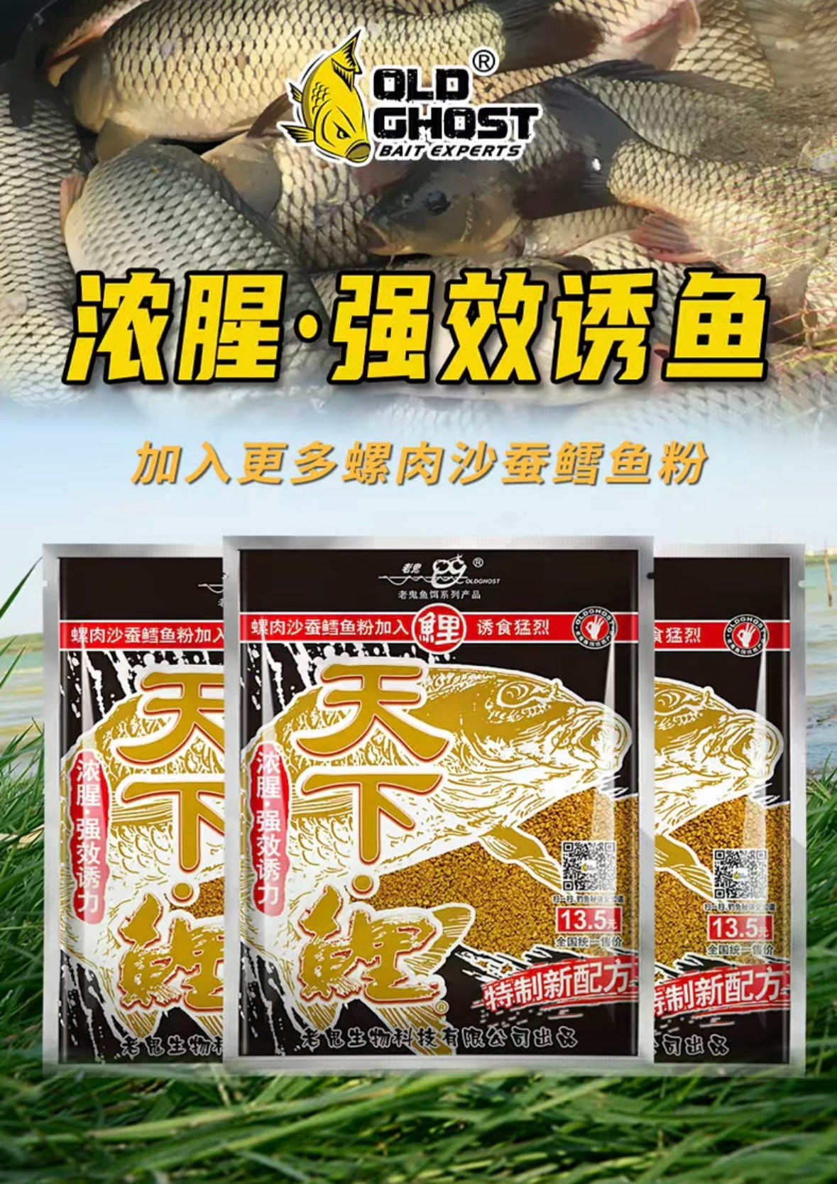 Рибне борошно з тріски, вовчка, м'ясо равлика, рослинні та тваринні білки, амінокислоти тощо. Комплексна приманка.